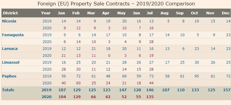 Общее количество продаж не-киприотам, на долю которых в июле пришлось 33% всех продаж, упало на 36% по сравнению с июлем 2019 года. Хотя продажи в Никосии оставались стабильными, продажи недвижимости не-киприотам упали в четырех значимых районах острова.