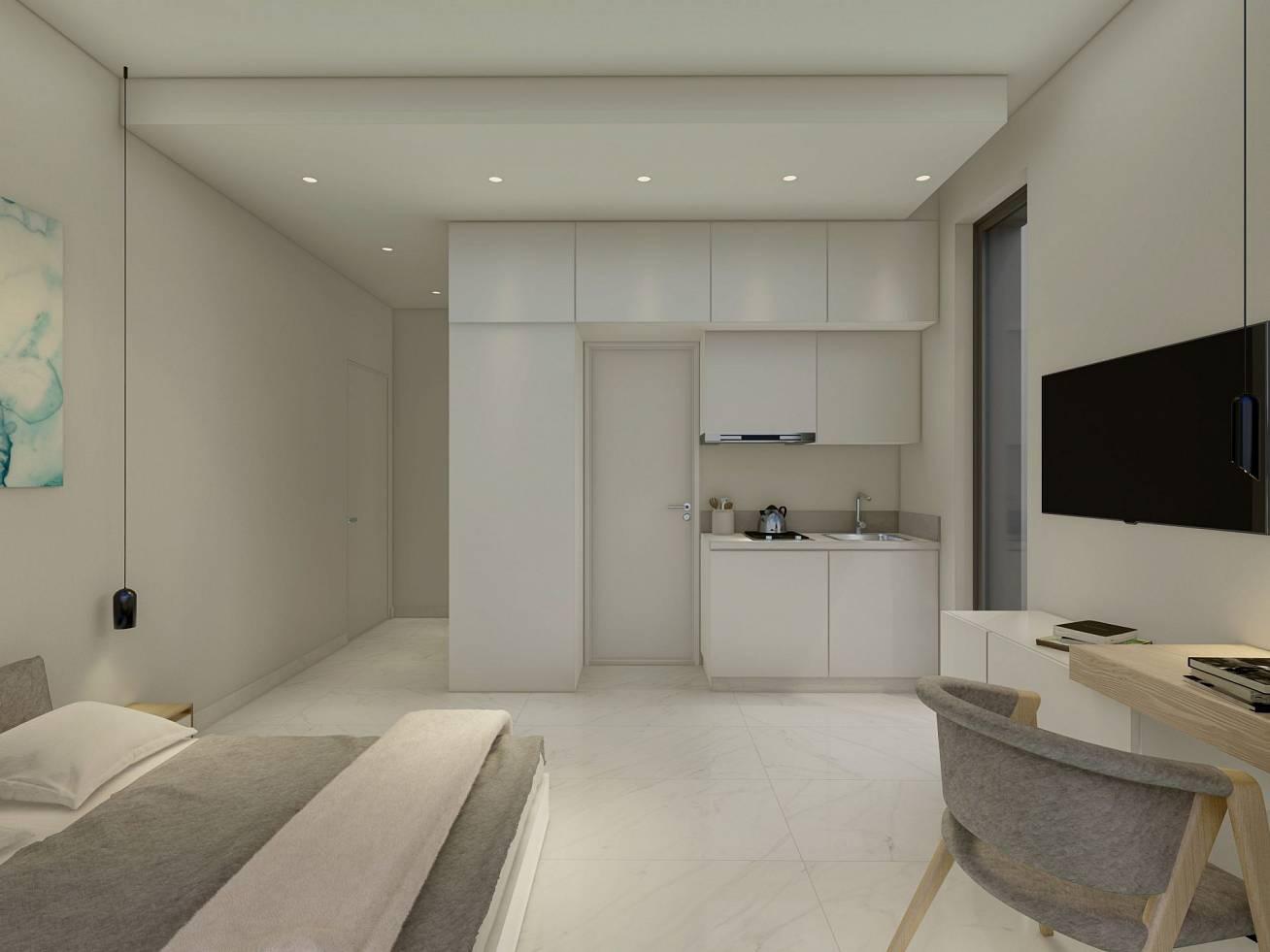 Студии полностью укомплектуют современной мебелью, в них оборудуют небольшие кухни, оснащенные встроенной техникой и гранитной рабочей поверхностью, а также ванные комнаты, облицованные и отделанные материалами высочайшего качества.