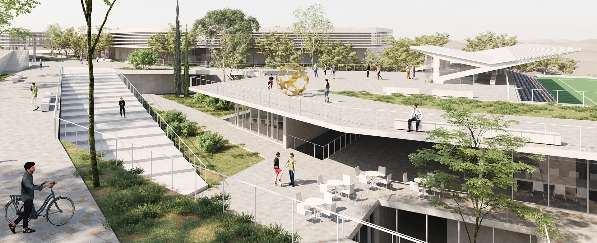 - Создание на уровне первого этажа зоны отдыха для гостей, откуда будет осуществляться общественный доступ на возвышенное плато – бельведер в виде кругового пешеходного движения от входа на стадионы и обратно.