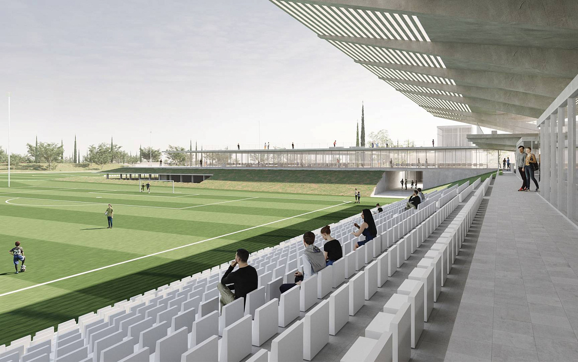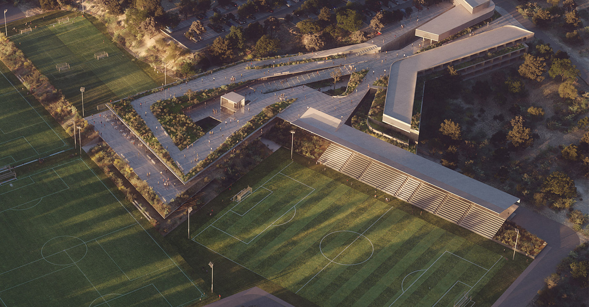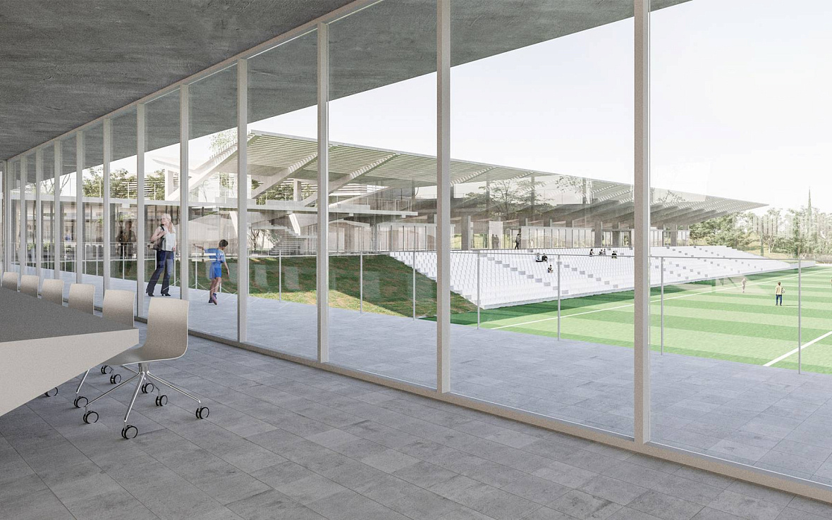 Новый спортивный центр для КОП включает футбольные поля со всеми сопутствующими помещениями, офисное здание и другие вспомогательные учебные и гостиничные объекты, соединенные между собой площадью с ландшафтной зоной.